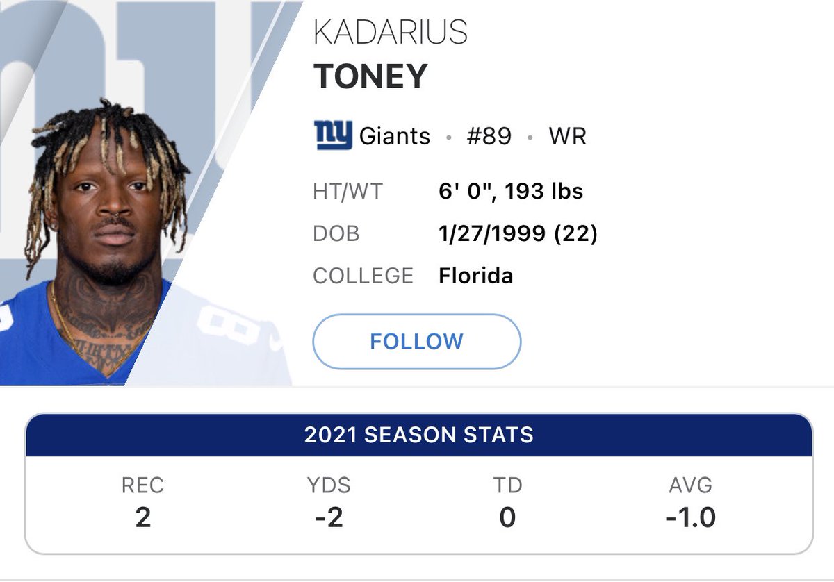 Toney played college football at Florida and was drafted by the Giants in the first round of the 2021 NFL Draft. Kadarius Toney stats game logs red zone data fantasy football news rankings projections injury updates strength of schedule and more. Latest on New York Giants wide receiver Kadarius Toney including news stats videos highlights and more on ESPN.